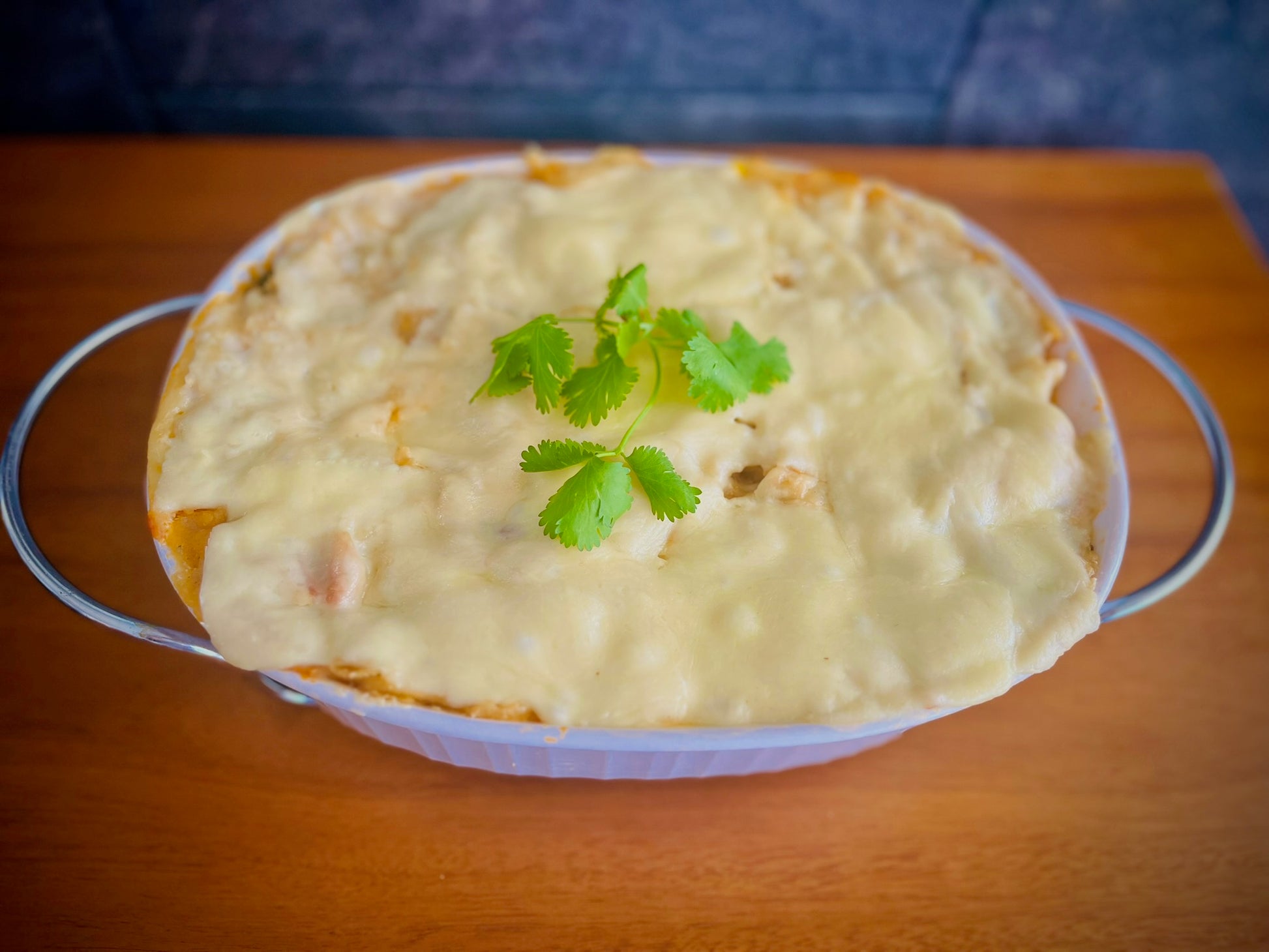 Pollo deshebrado guisado en salsa roja con elote, rajas de chile poblano, entre cama de tortilla con queso y crema